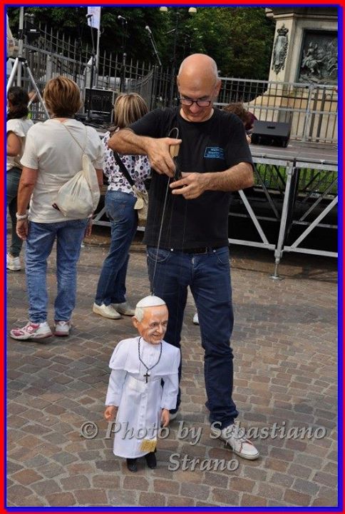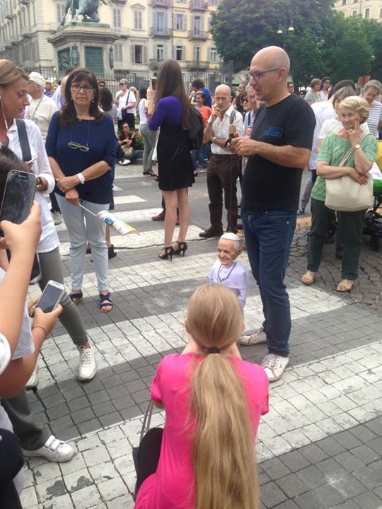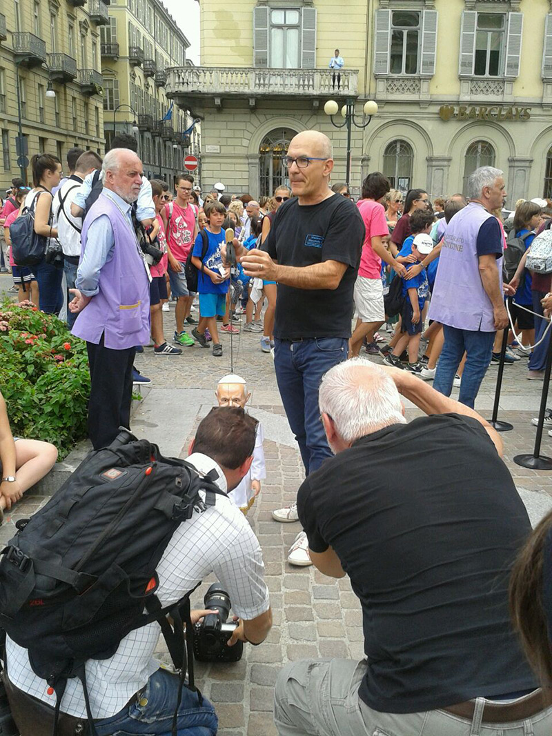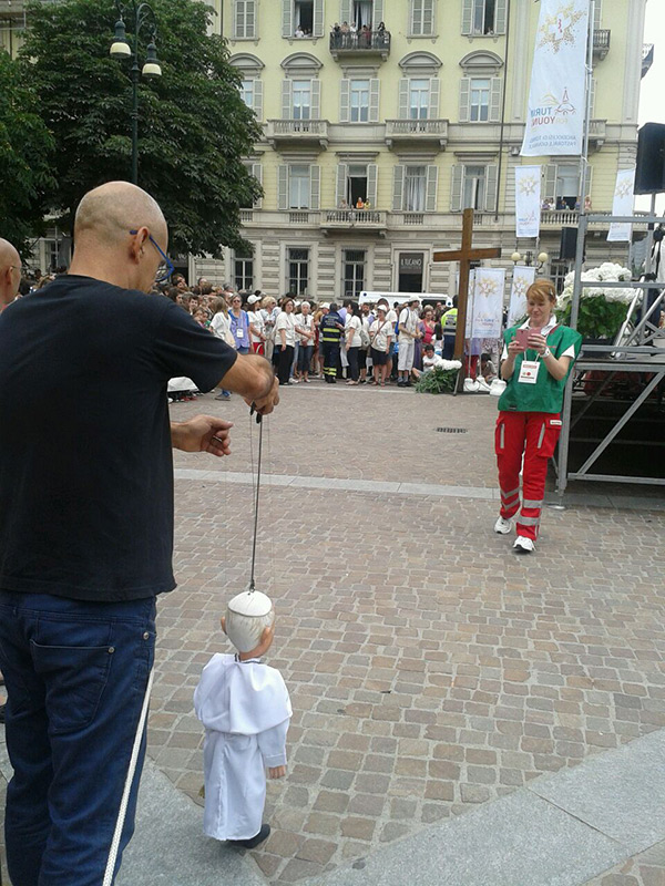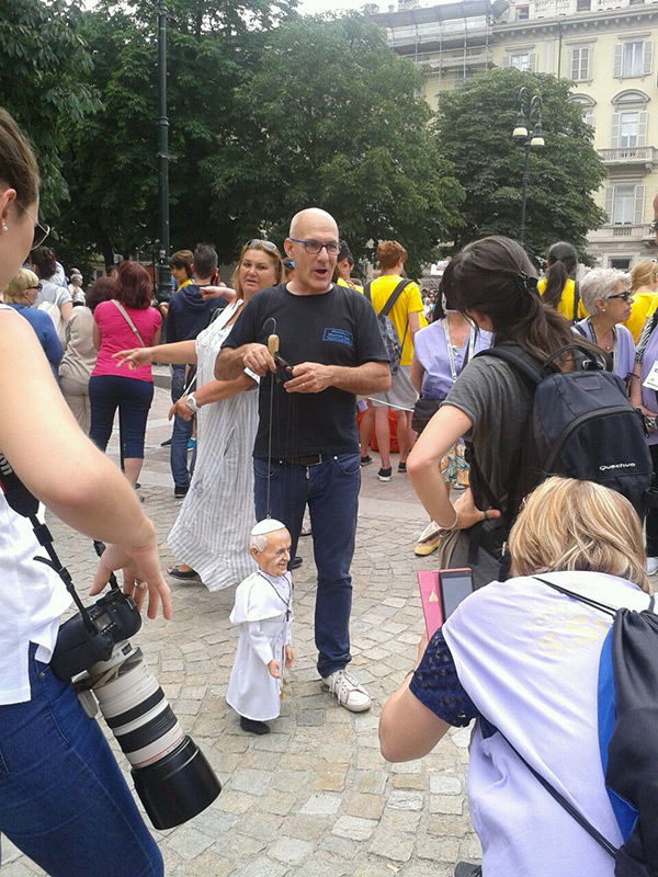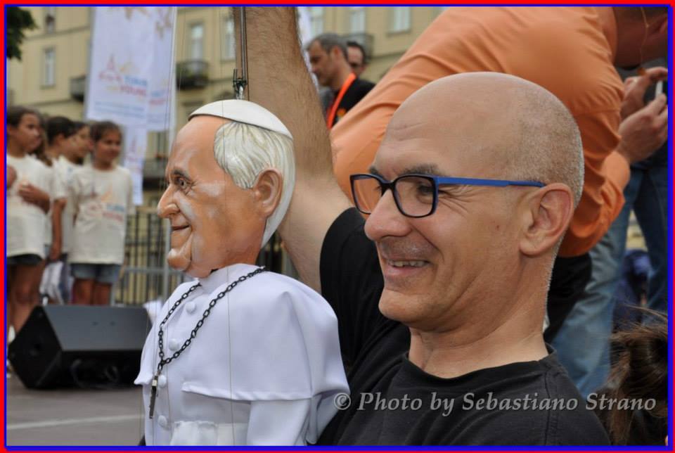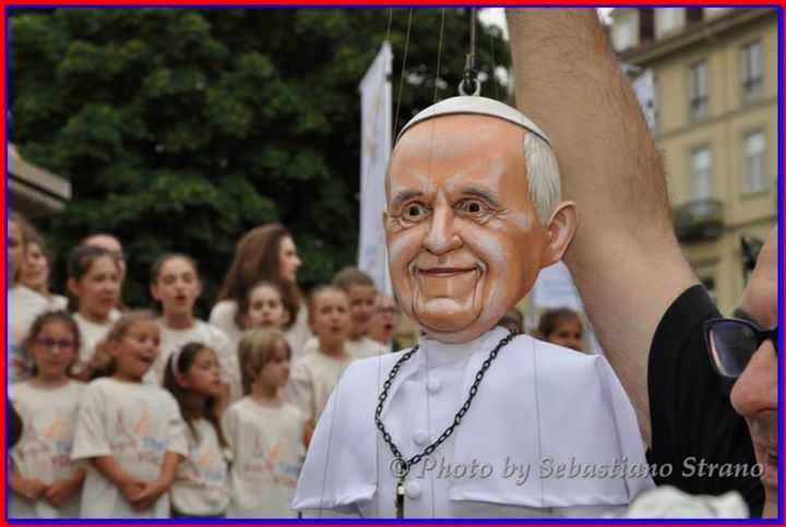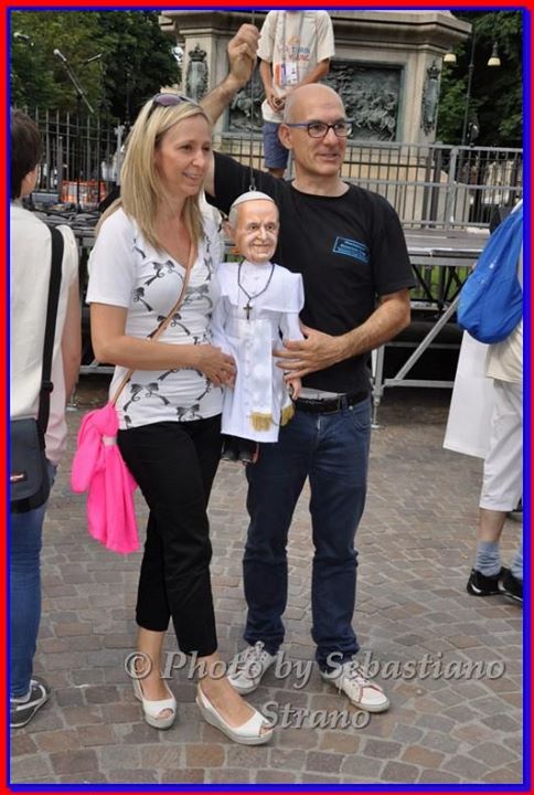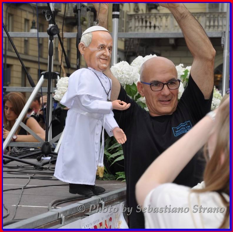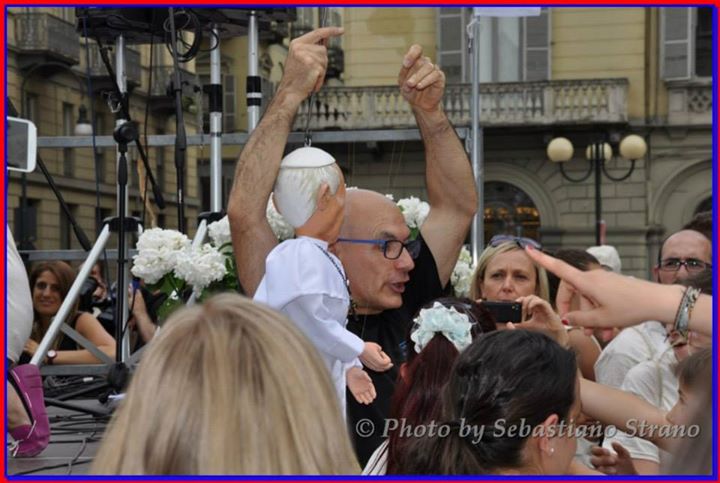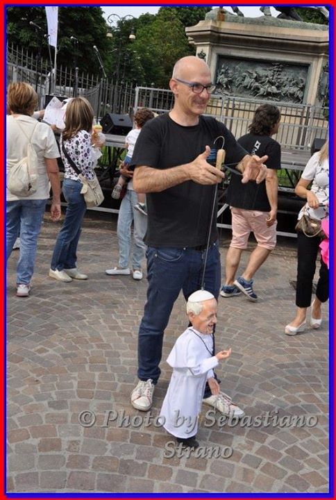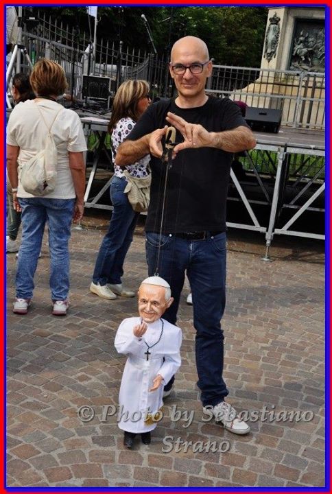 Non poteva mancare tra le nostre sosia-marionette quella di Papa Francesco. Forse, e senza forse, il personaggio più importante al mondo in questo momento storico alquanto travagliato per tutto il nostro pianeta. Una persona che sta cercando con enorme sforzo di riportare la pace nel mondo, unendo popoli divisi da sempre. Sono molto orgoglioso di aver creato, insieme al mio staff, questa marionetta, lo stesso orgoglio con cui l’abbiamo mostrata a tutto il pubblico torinese convenuto in questa lunga due-giorni.